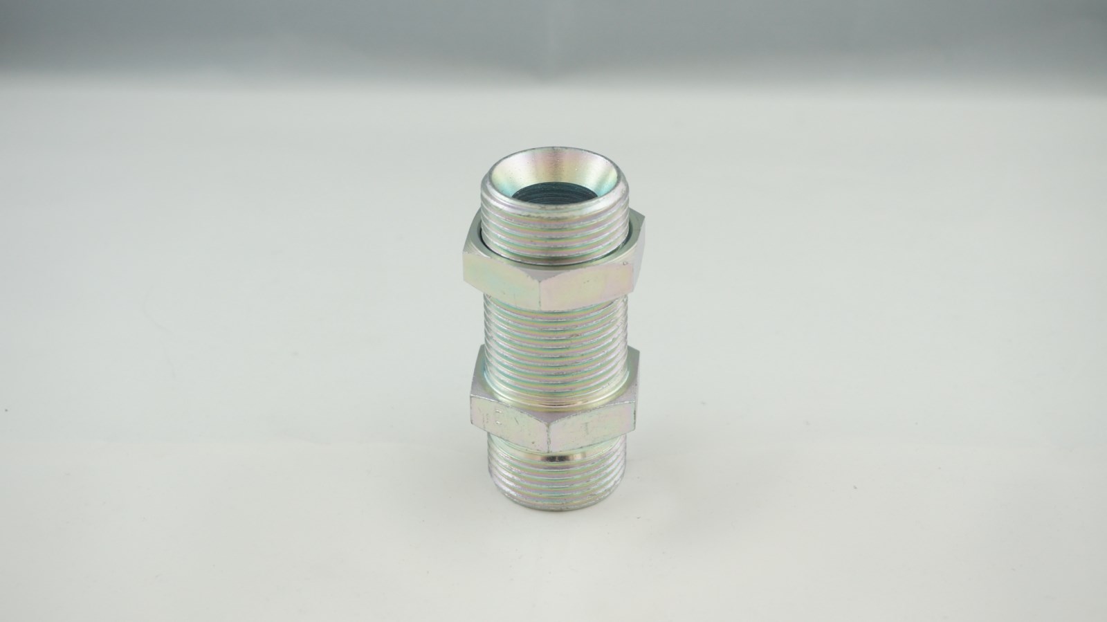 La référence B est un passage de cloison hydraulique droit ("passe-cloison") fileté mâle Bsp cône 60° en acier.