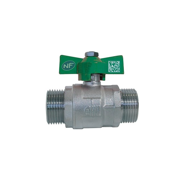 La vanne basse pression à sphère mâle / mâle possède une poignée papillon verte.