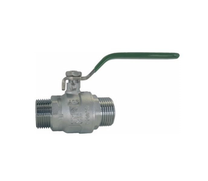 La vanne NF basse pression à sphère mâle / mâle à poignée plate verte est en laiton avec un revêtement 100% chromé.